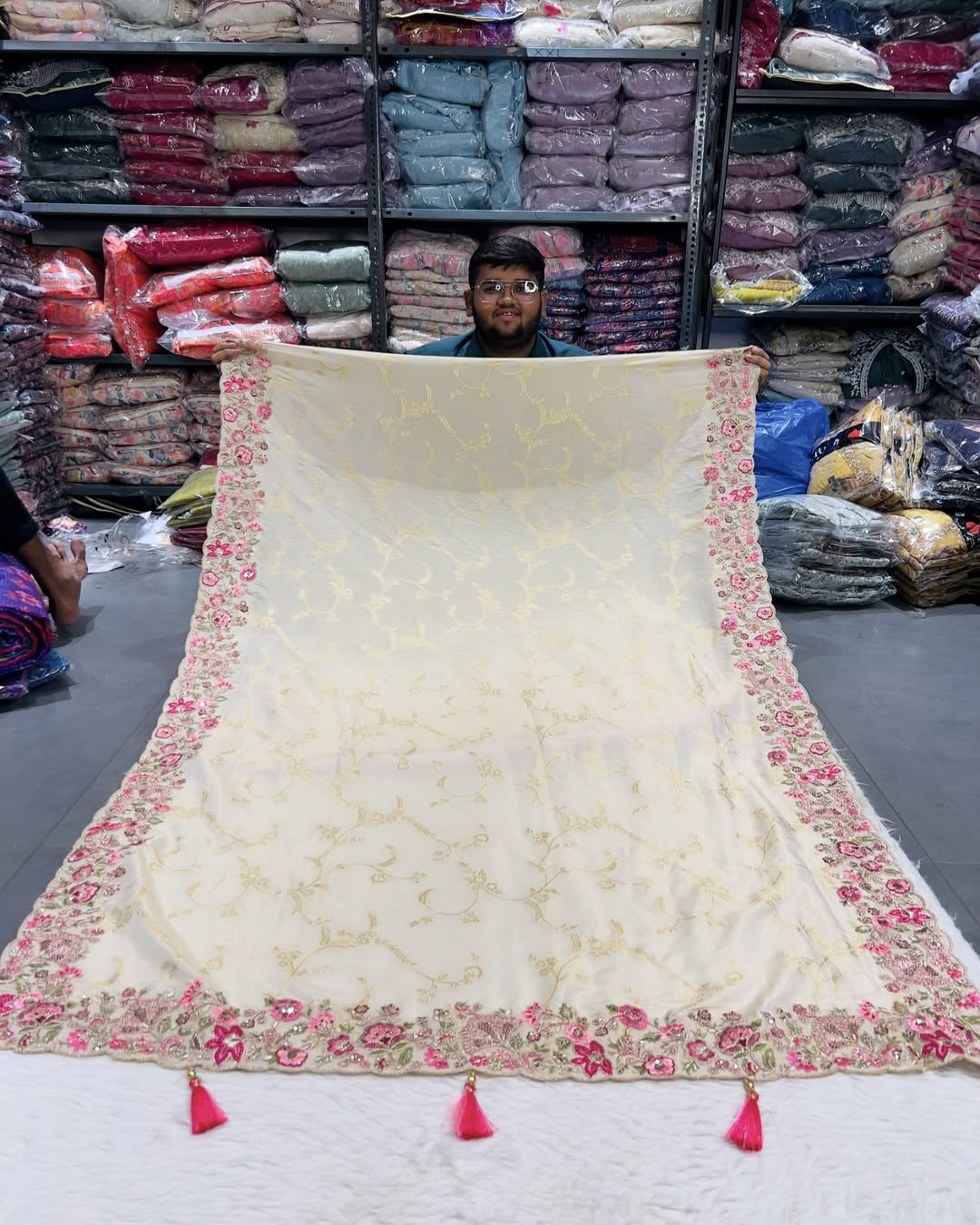 Add a touch of timeless grace to your wardrobe with this premium organza party wear saree from Shagun Fashion. Crafted in a soft off-white organza fabric, this saree is adorned with delicate golden thread embroidery and a stunning floral border in pink, green, and gold that brings vibrancy and charm. The pallu is finished with elegant pink tassels for a festive flair πΊ.