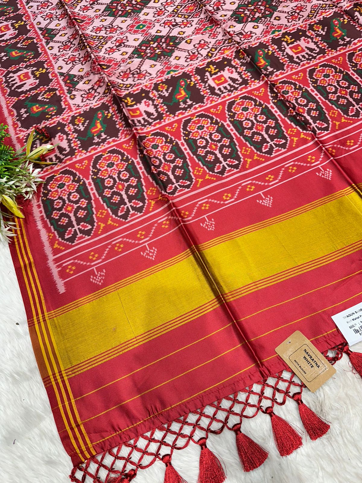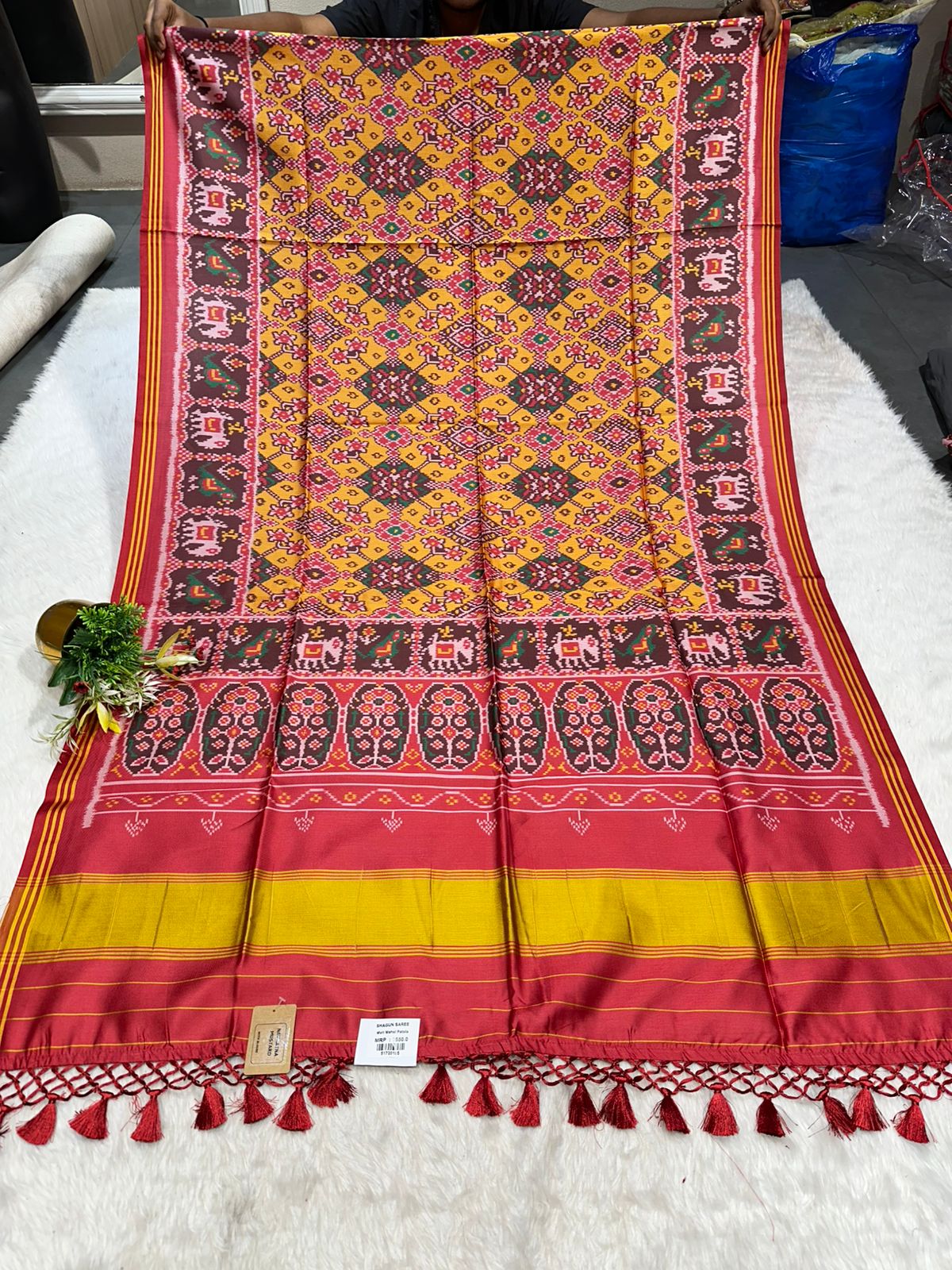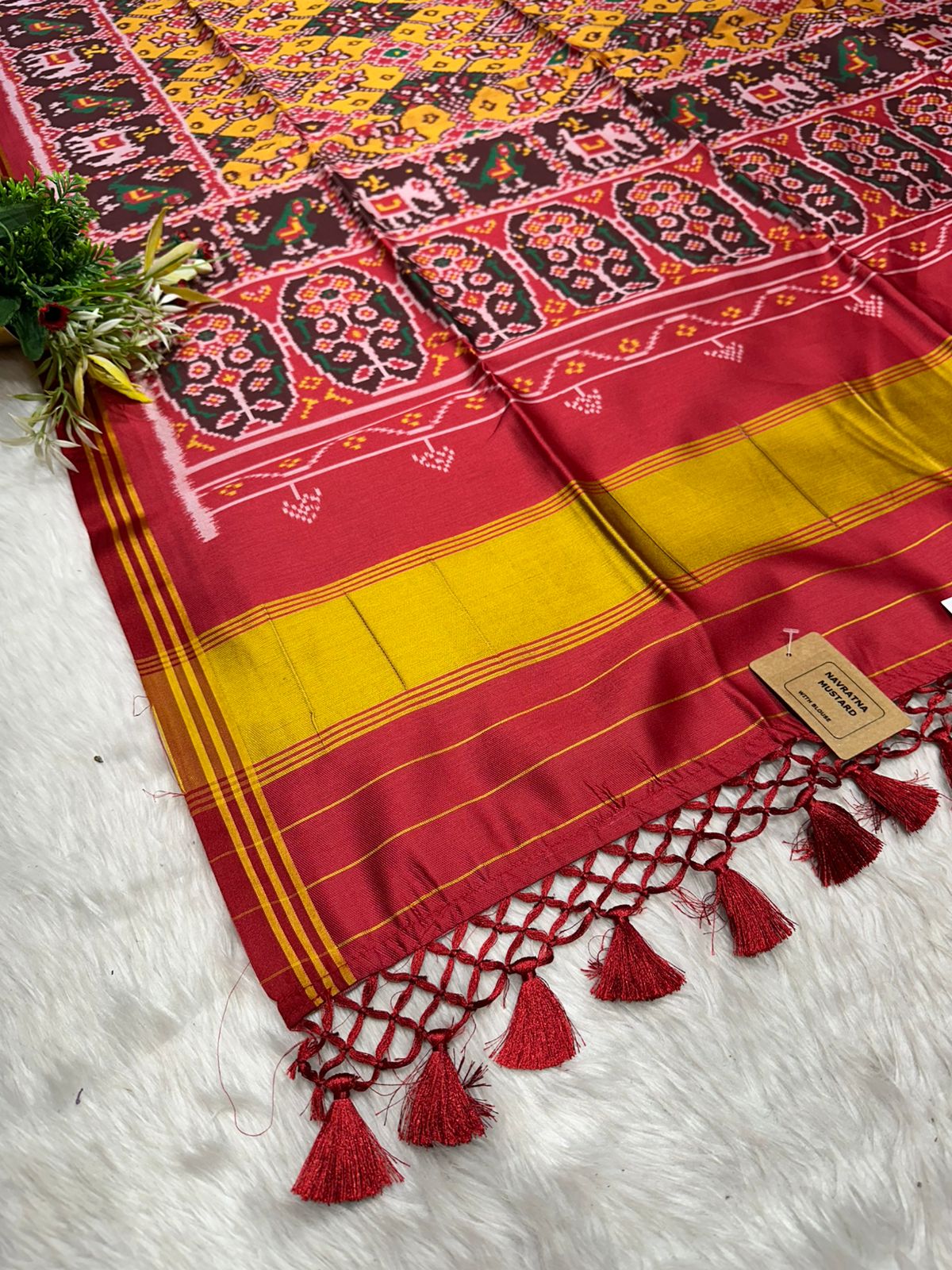 Add a touch of timeless tradition to your ethnic wardrobe with this beautiful Patola print saree from Zankhi Boutique by Shagun Sarees. Perfect for festive occasions or casual cultural gatherings, this saree features vibrant multicolor Patola motifs including floral vines, elephants, and parrots set against a striking mustard-yellow and rich maroon base. The elegant pallu with contrast border, detailed threadwork, and decorative tassels create a graceful, festive look. Crafted for comfort and affordability, this budget-friendly saree is ideal for women seeking a unique ethnic vibe without compromising on style. Whether for weddings, haldi ceremonies, or Navratri, this saree blends affordability with aesthetic appeal. 🌼