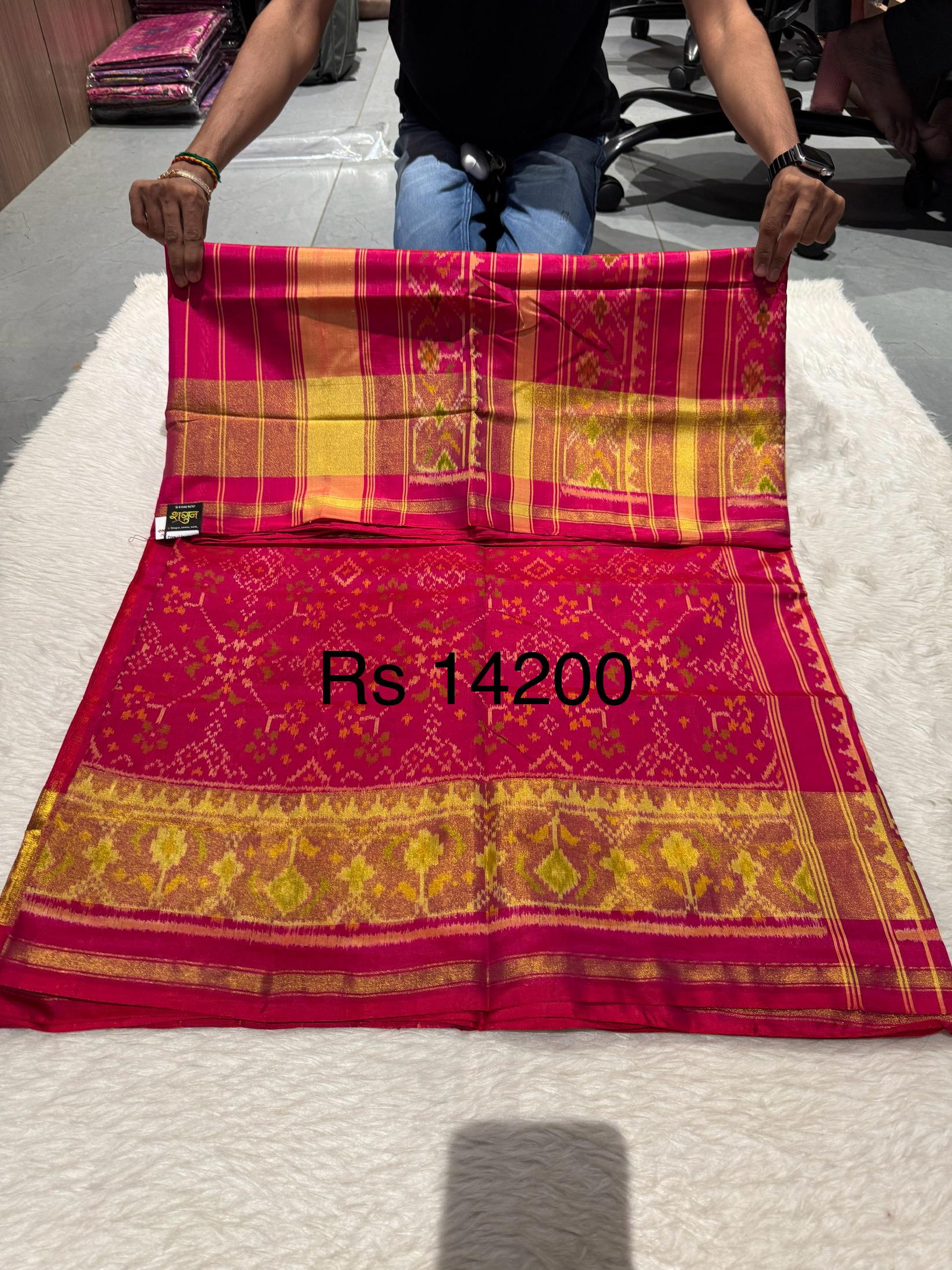 โจ Turn heads with this Pure Rajkoti Patola Silk Saree in beautiful pink with a golden patta border ๐ธ๐.