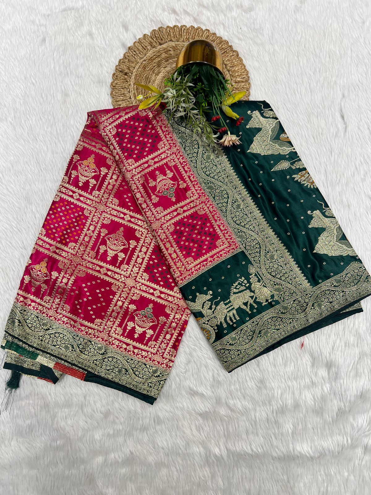 Celebrate tradition in style with this elegant Bandhani saree in Gharchola design, featuring Lagdi Patto, playful latkan pallu, and a rich two-tone designer pallu πΊ Perfect for Navratri, weddings & festive wear ππ