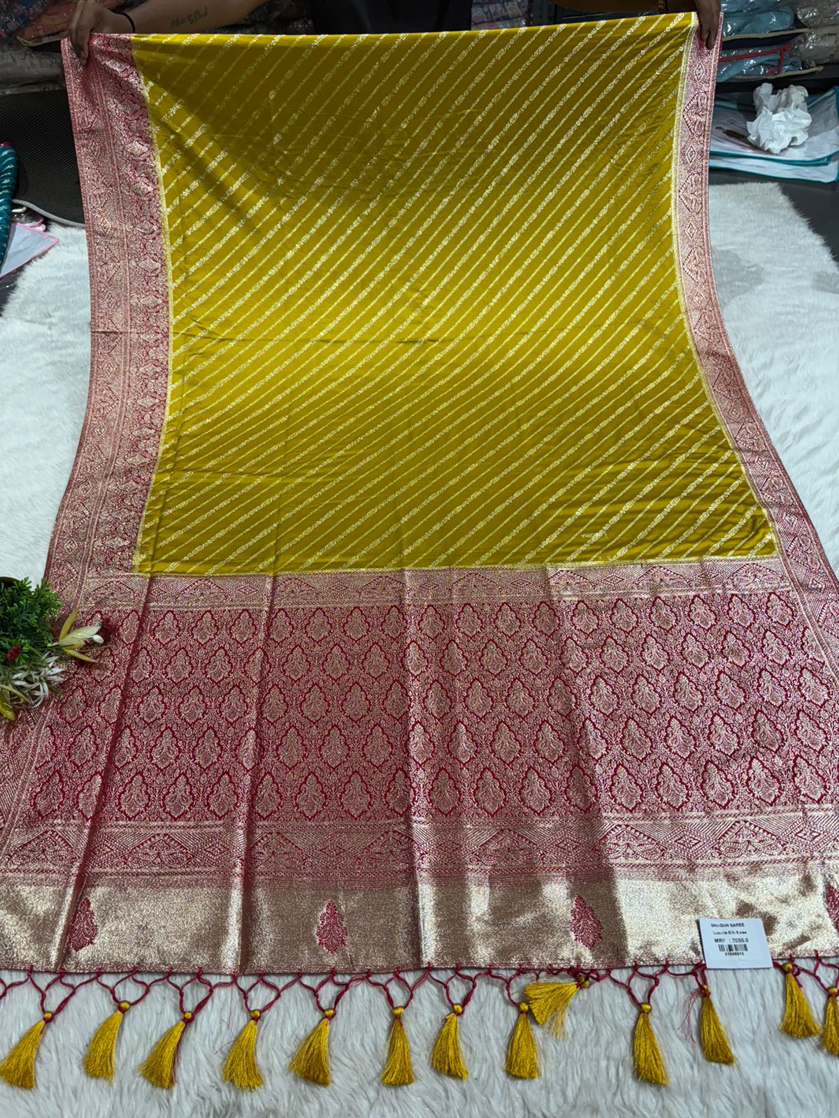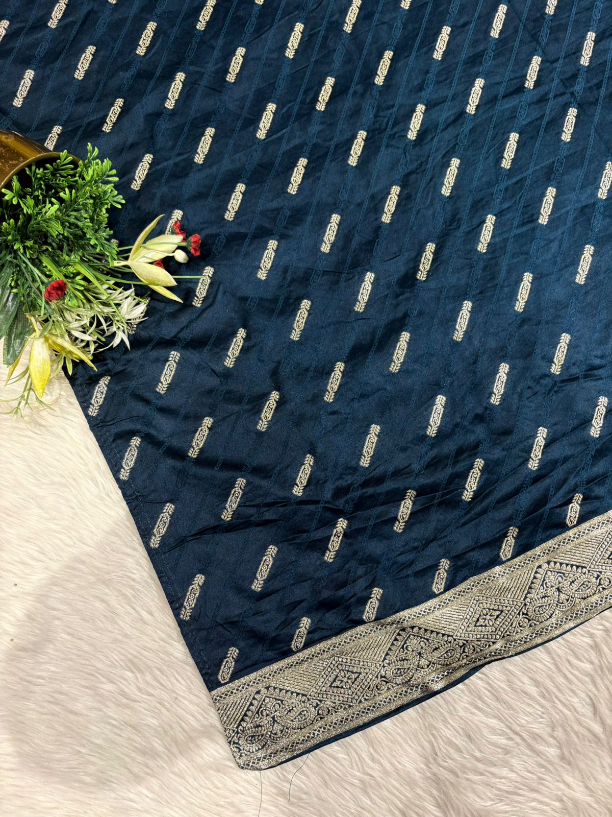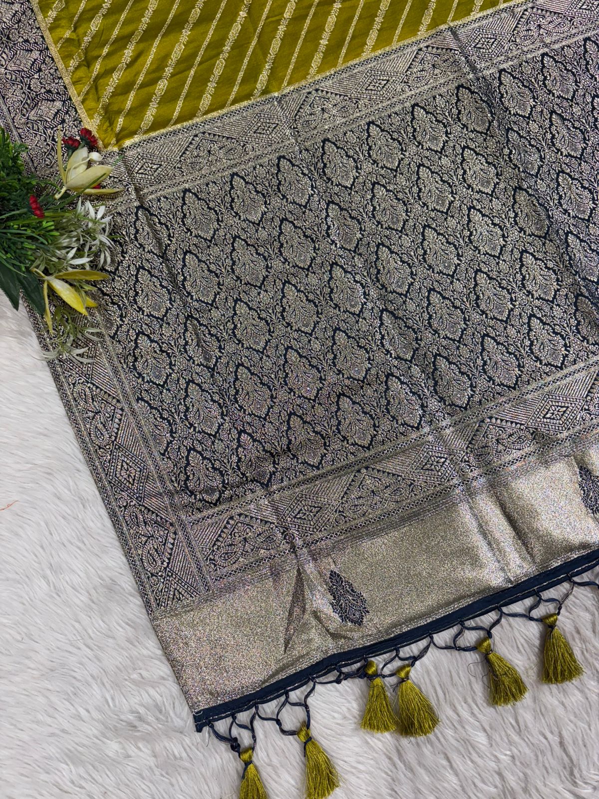 Elevate your ethnic wardrobe with this luxurious Banarasi silk saree from the house of Shagun Fashion. Crafted with intricate zari weaving, the saree features elegant diagonal patterns across the body, adding a refined festive charm. The pallu showcases rich floral and paisley brocade motifs, finished with stylish tassels that bring a graceful flow to your drape. An intricately woven broad border frames the saree, highlighting its classic appeal. Paired with a matching brocade blouse piece, this ensemble offers the perfect balance of tradition and sophistication. Ideal for weddings, festivals, parties, and cultural events, this timeless saree from Zankhi Boutique by Shagun Sarees is designed to make you stand out effortlessly. Perfect for the woman who cherishes elegance with a touch of heritage. 🌟🧡