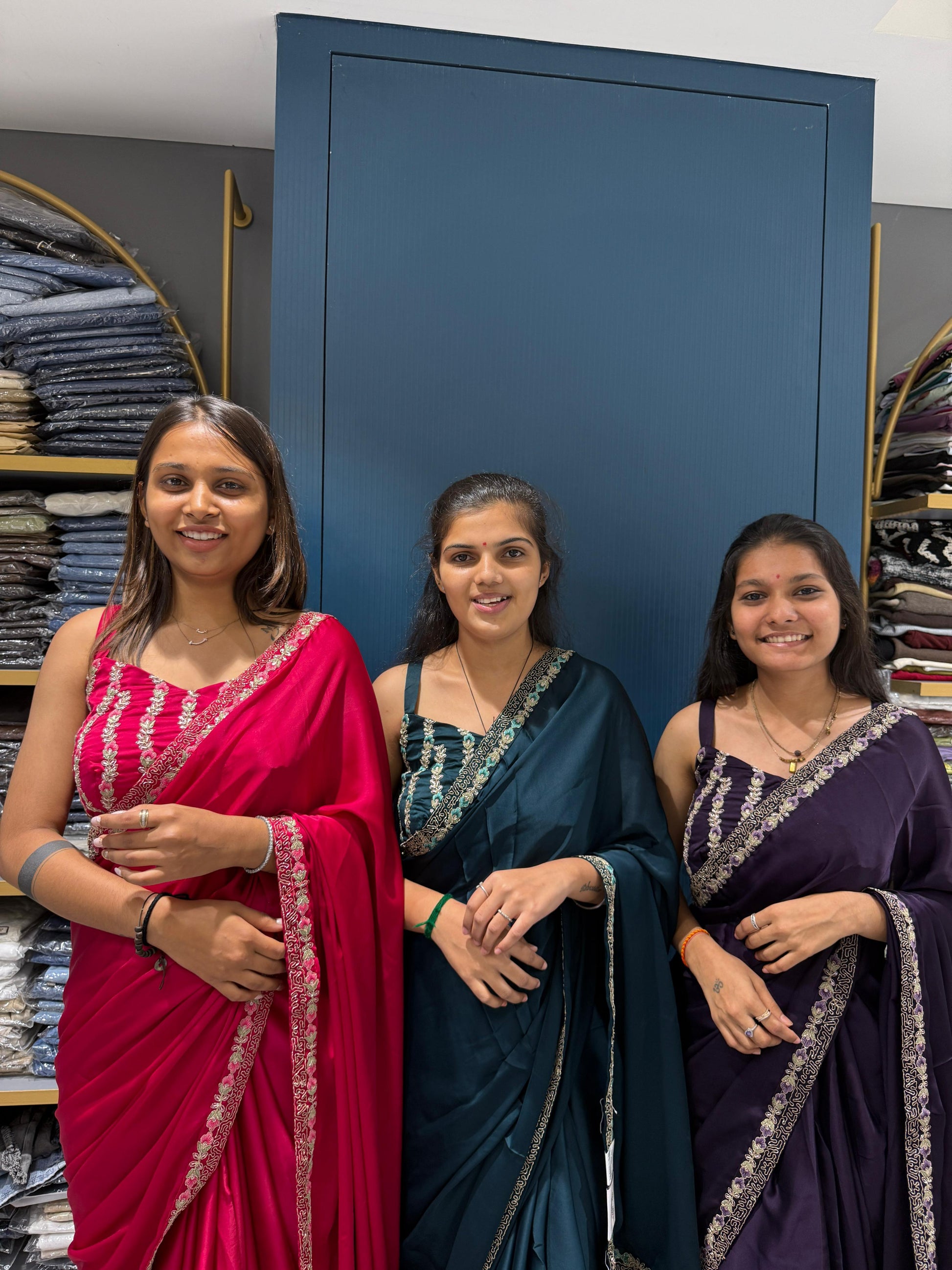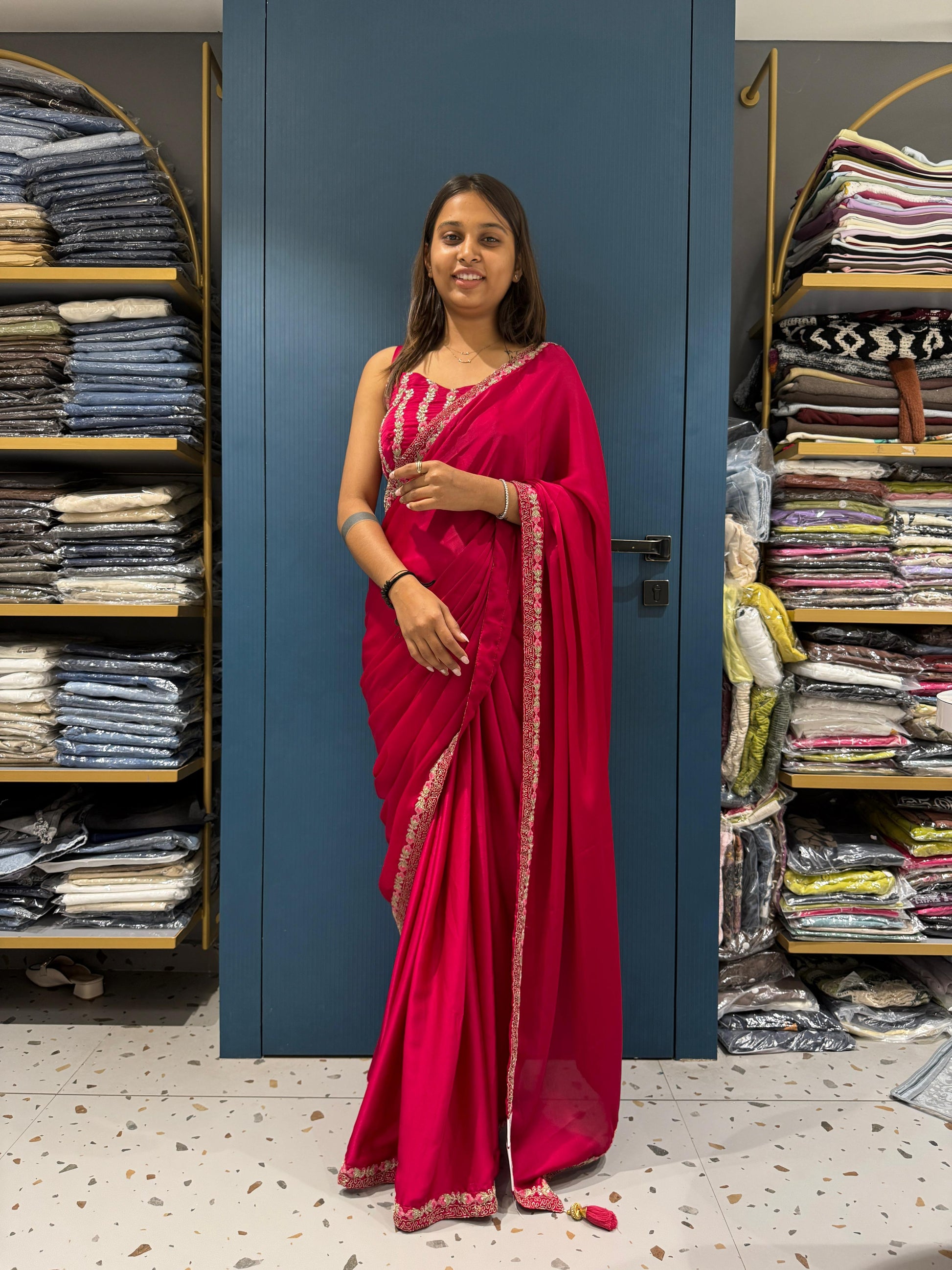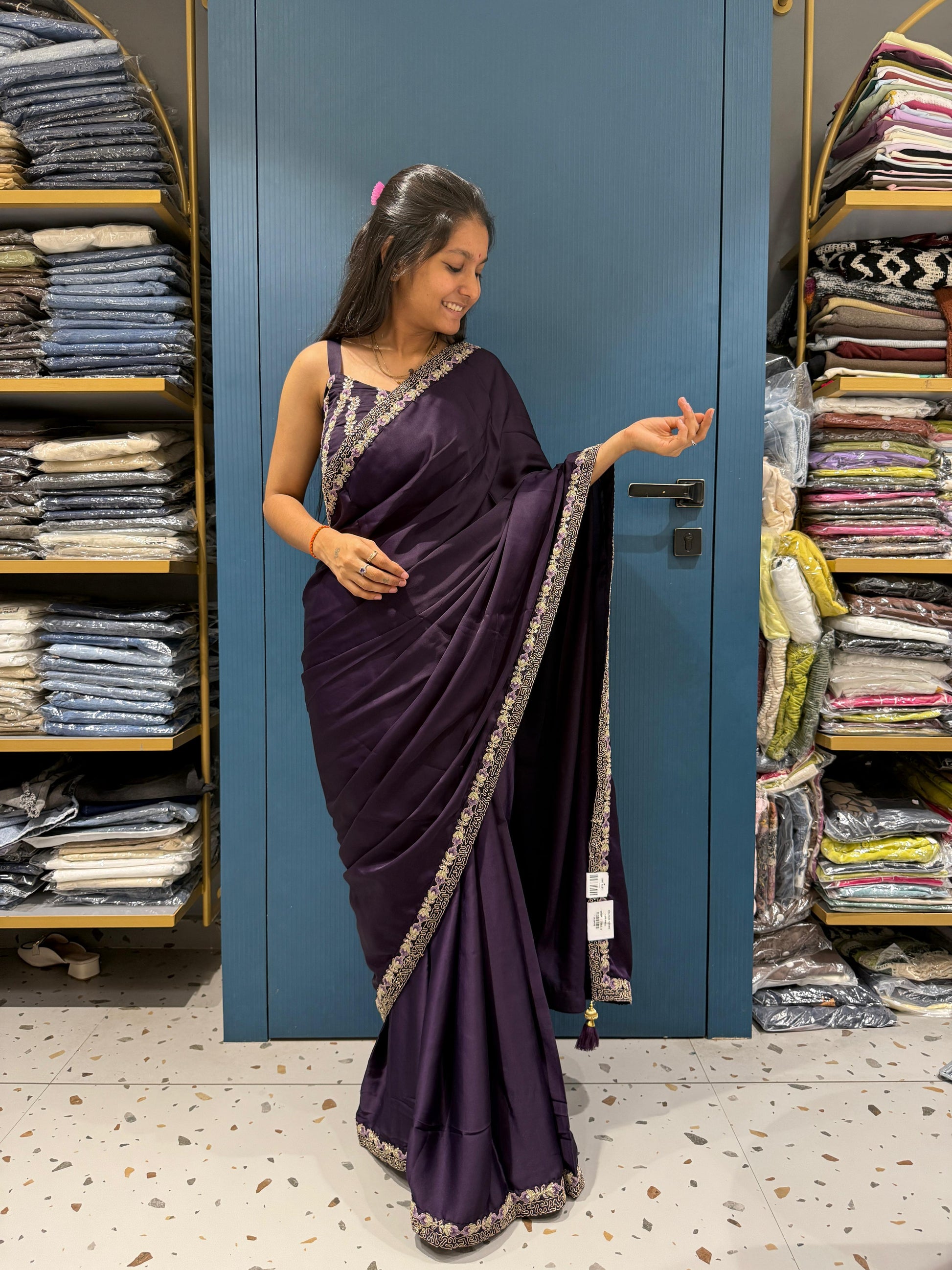 Turn heads with this premium designer party wear saree from Shagun Fashion 💫. This stunning magenta saree features a beautifully embroidered border that adds a touch of royal elegance 👑. The readymade spaghetti strap blouse is adorned with matching threadwork, blending tradition with modern fashion seamlessly.