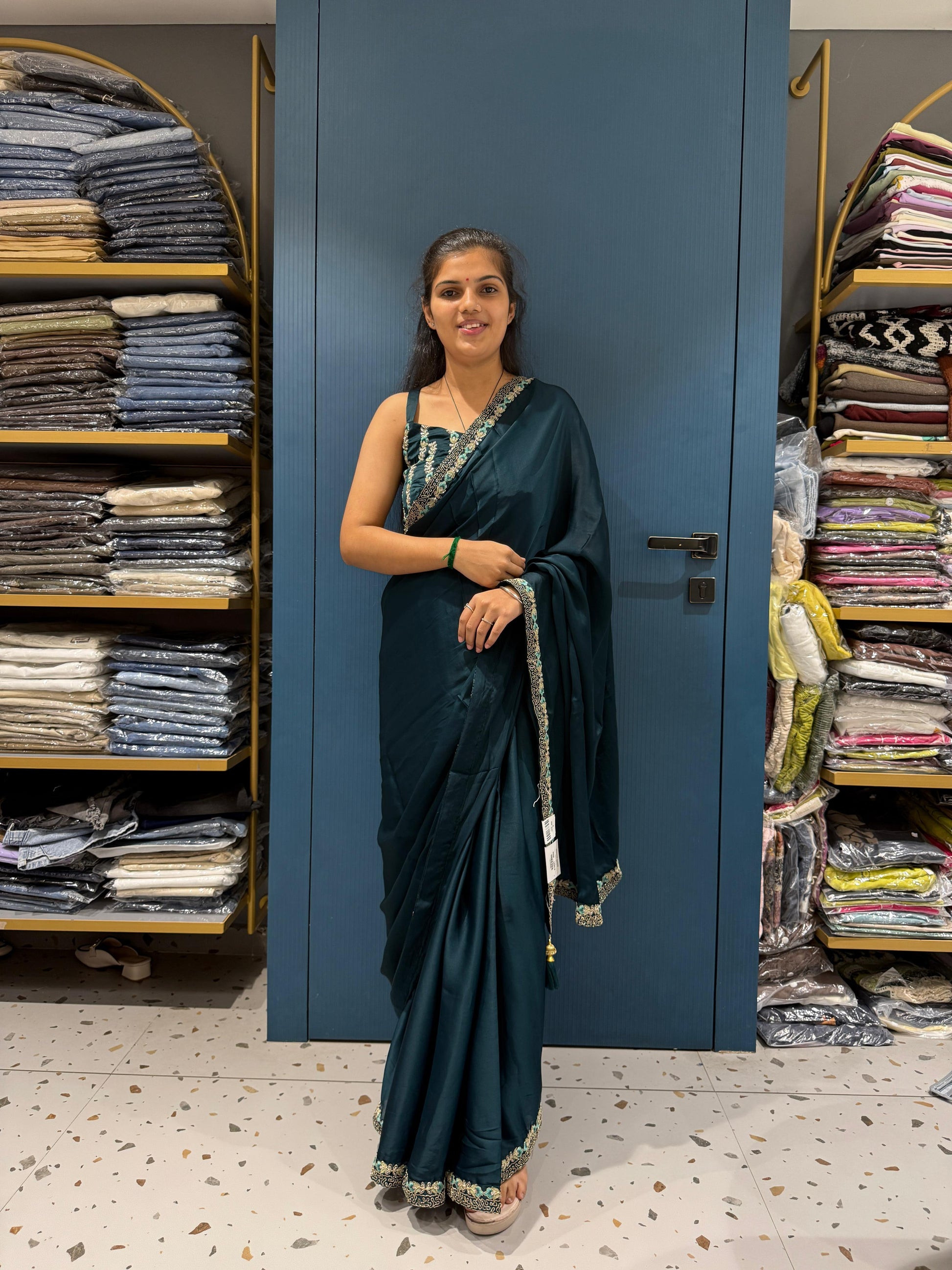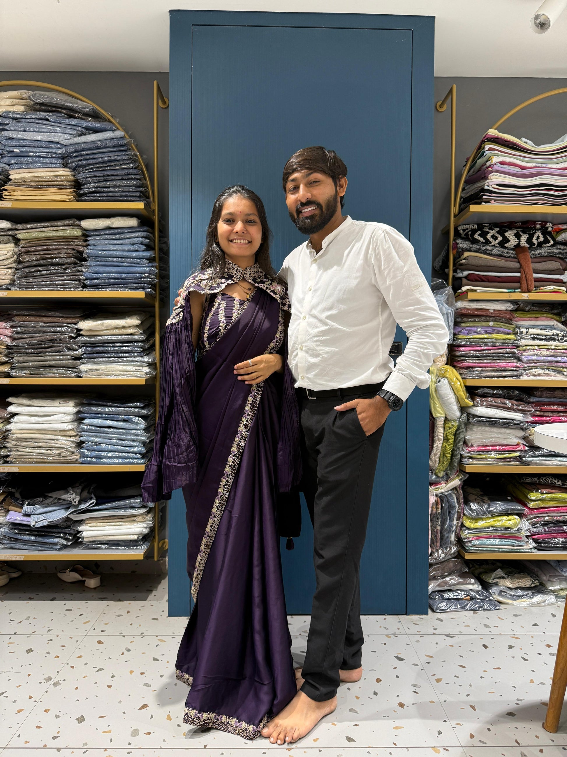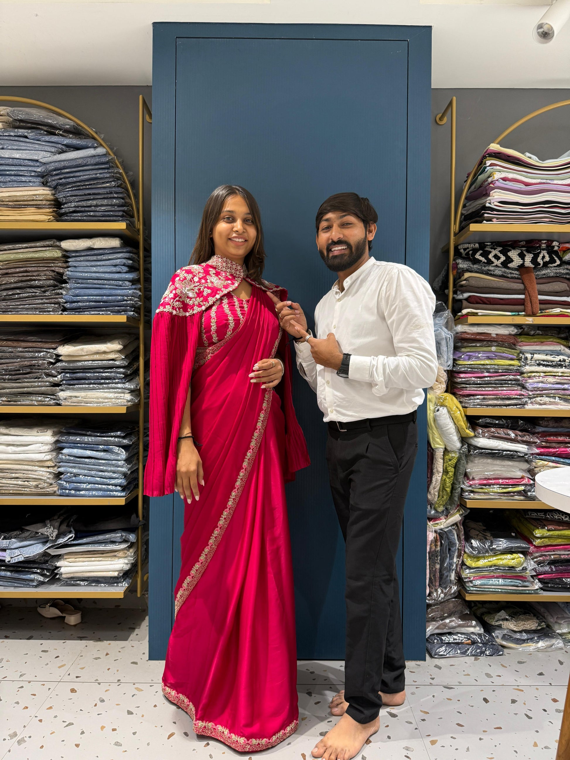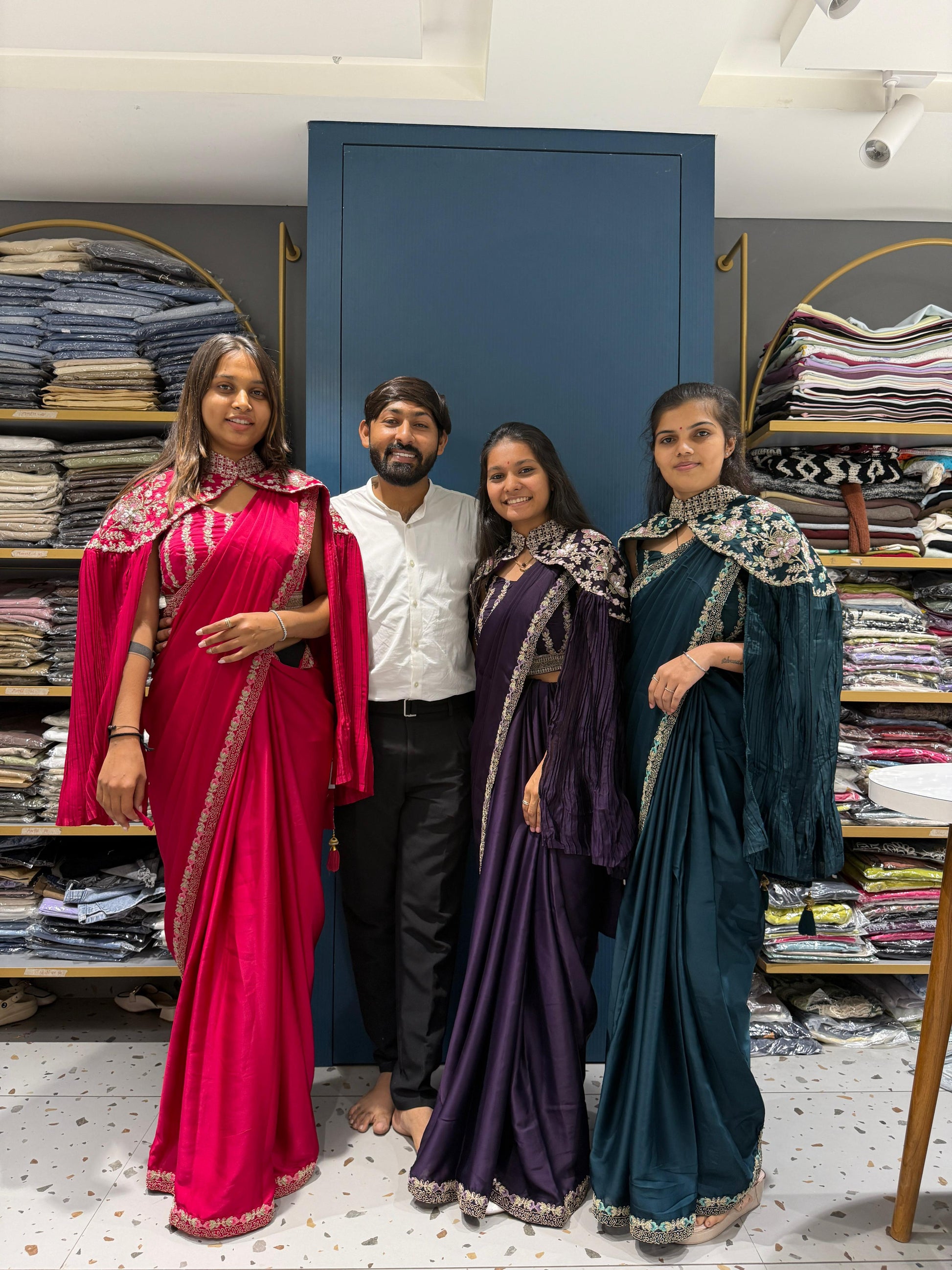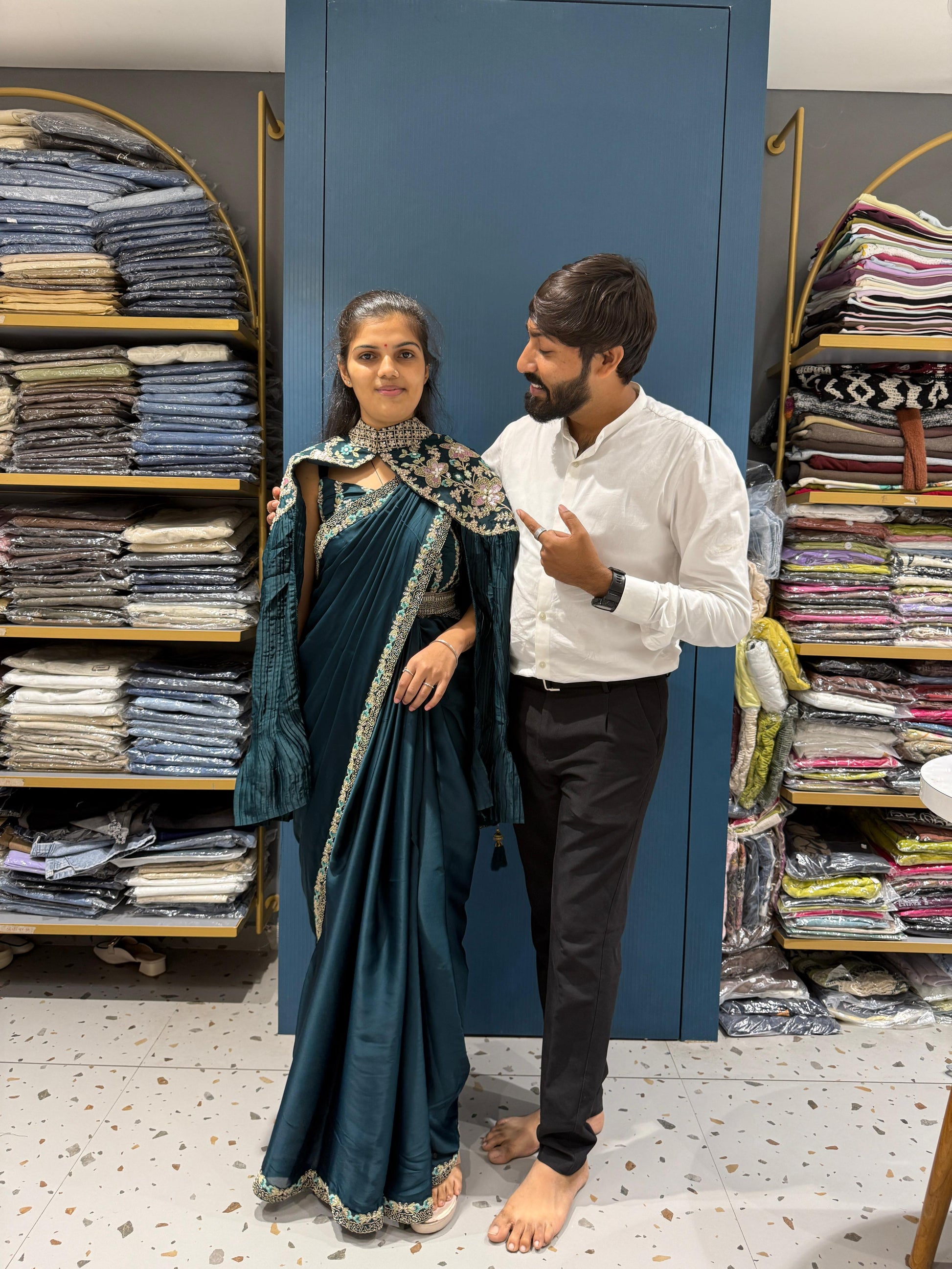 What truly sets this look apart is the embroidered shrug with pleated sleeves – a trendy layer that gives this saree a high-fashion edge 💃. Perfect for festive events, weddings, receptions, or evening parties, this saree set offers a ready-to-wear designer look without any hassle.