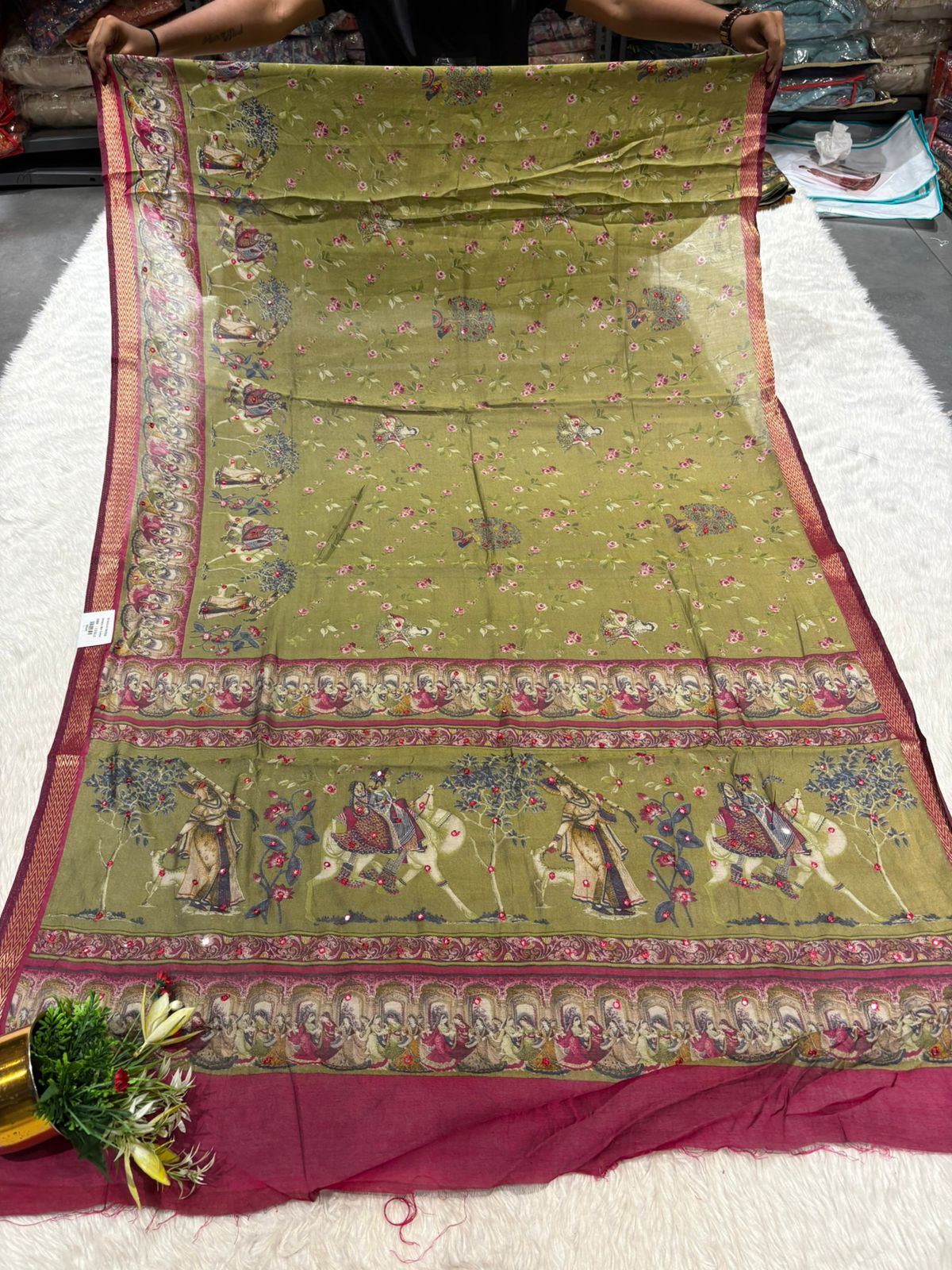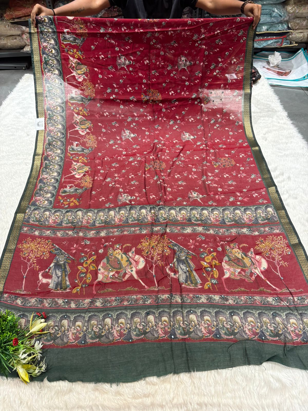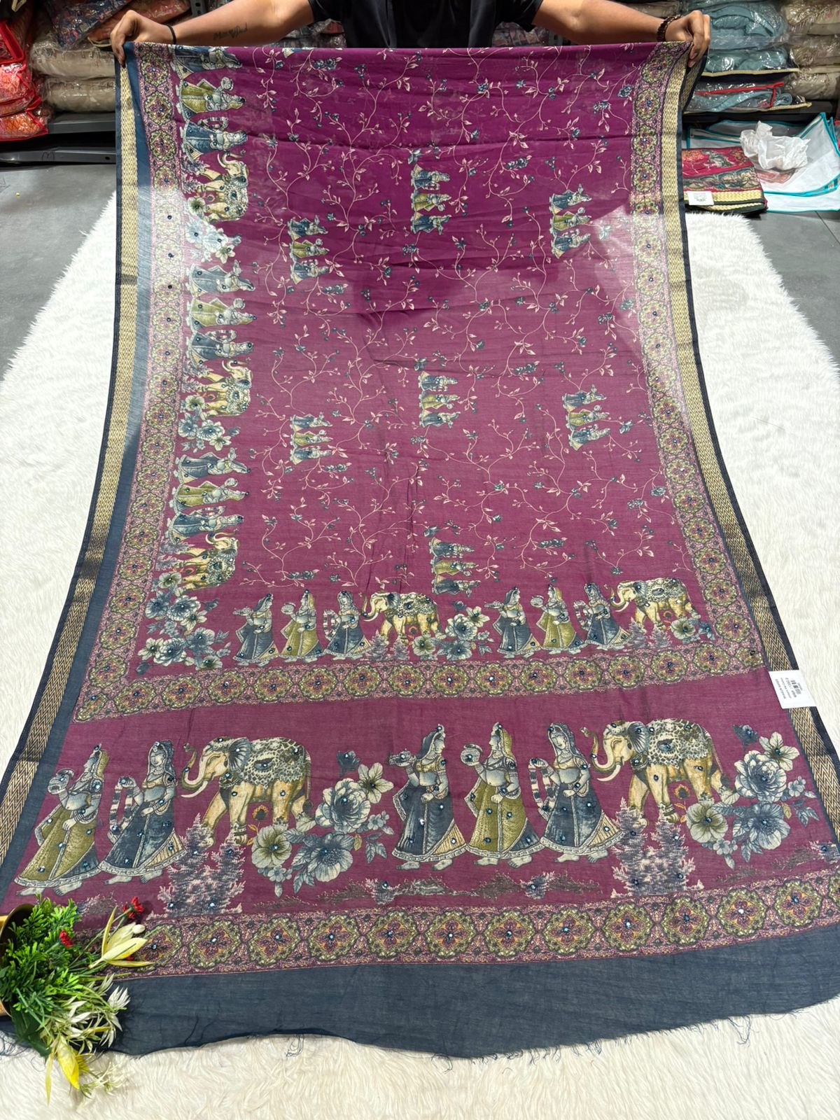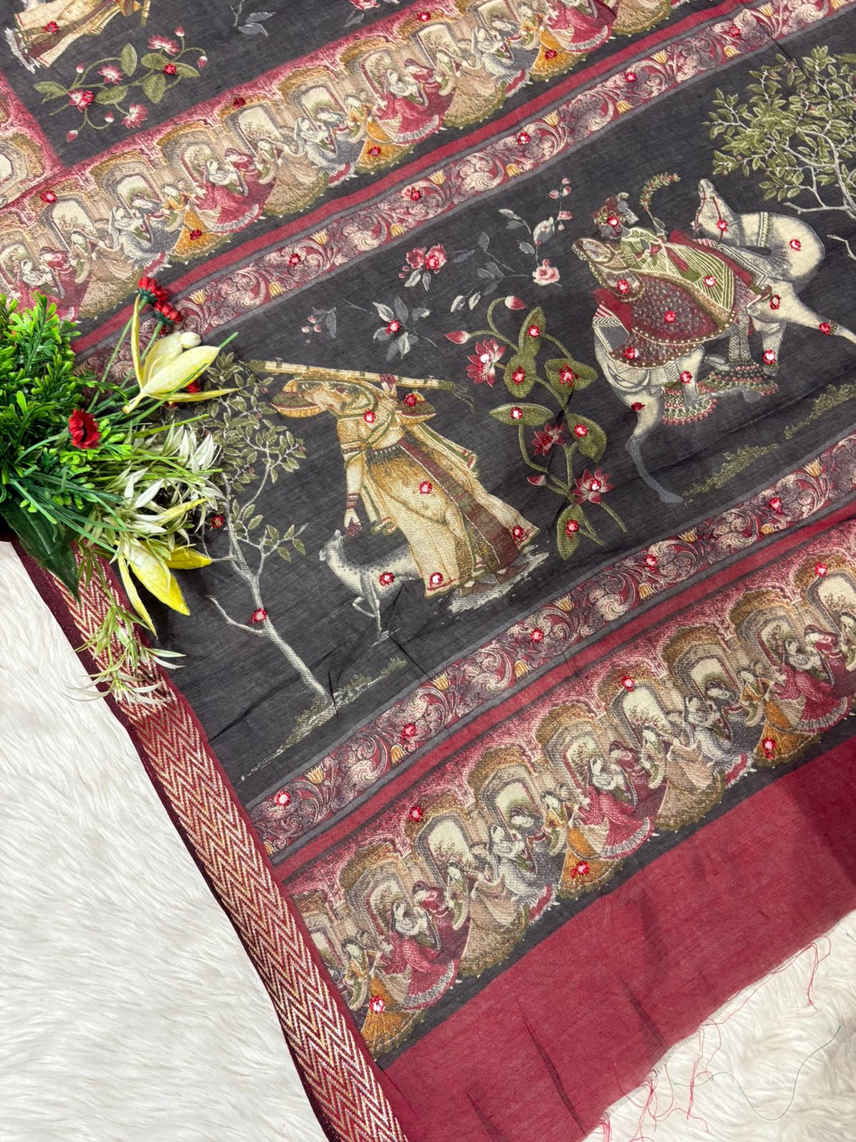 This Mughal art-inspired saree from Shagun Sarees by Zankhi Boutique is a timeless piece that brings together rich heritage and modern comfort. ๐ Crafted in a soft, breathable fabric, this elegant saree features detailed royal figures, dancing women, floral vines, and elephant motifs that tell a story of cultural richness. ๐ The intricate border with traditional zigzag weaving and delicate sequin work adds a touch of grace, making it perfect for both daily ethnic wear and festive gatherings. Whether you're styling it for a casual outing, family celebration, or a temple visit, this saree from Shagun Fashion offers a balanced blend of tradition and versatilityโideal for both younger and older women. ๐ธโจ