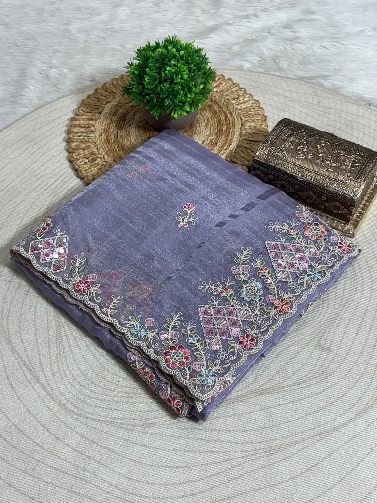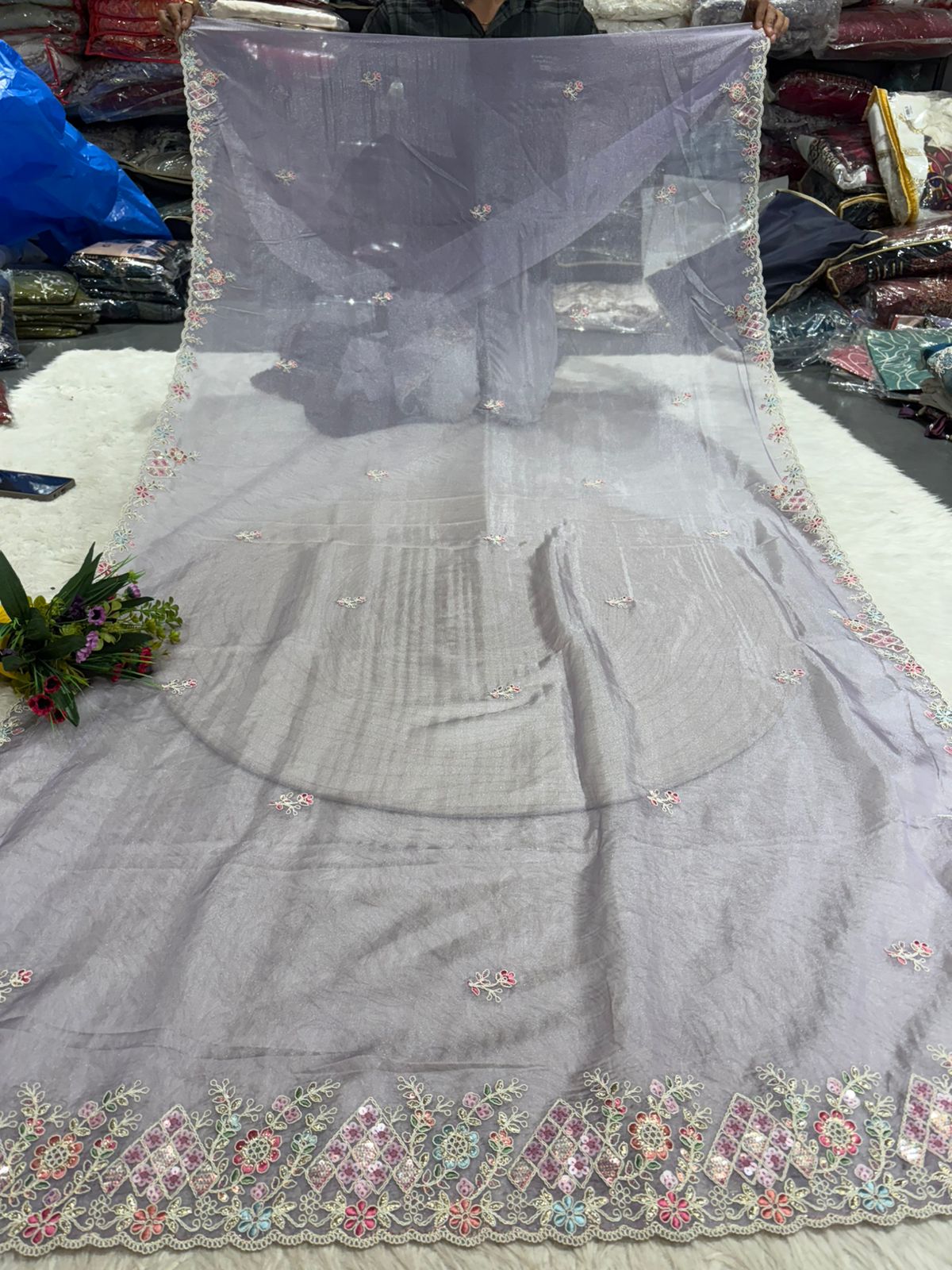 Embrace timeless elegance with this organza saree, beautifully designed by Shagun Sarees. Crafted from a sheer, lightweight organza-silk blend, this saree is adorned with delicate floral zari embroidery along the borders, featuring multicolor threadwork and subtle sequin accents for a luxurious shimmer.