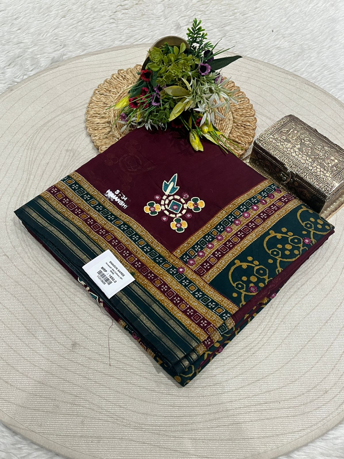 Discover timeless elegance with this beautifully embroidered saree by Shagun Fashion. Featuring delicate scattered motifs on the drape, a finely detailed border, and an exquisite pallu with floral-inspired designs, this saree is perfect for festive occasions, parties, and weddings. Finished with tassels for a graceful touch, this saree from Shagun Sarees blends tradition with modern style, available exclusively at Zankhi Boutique.