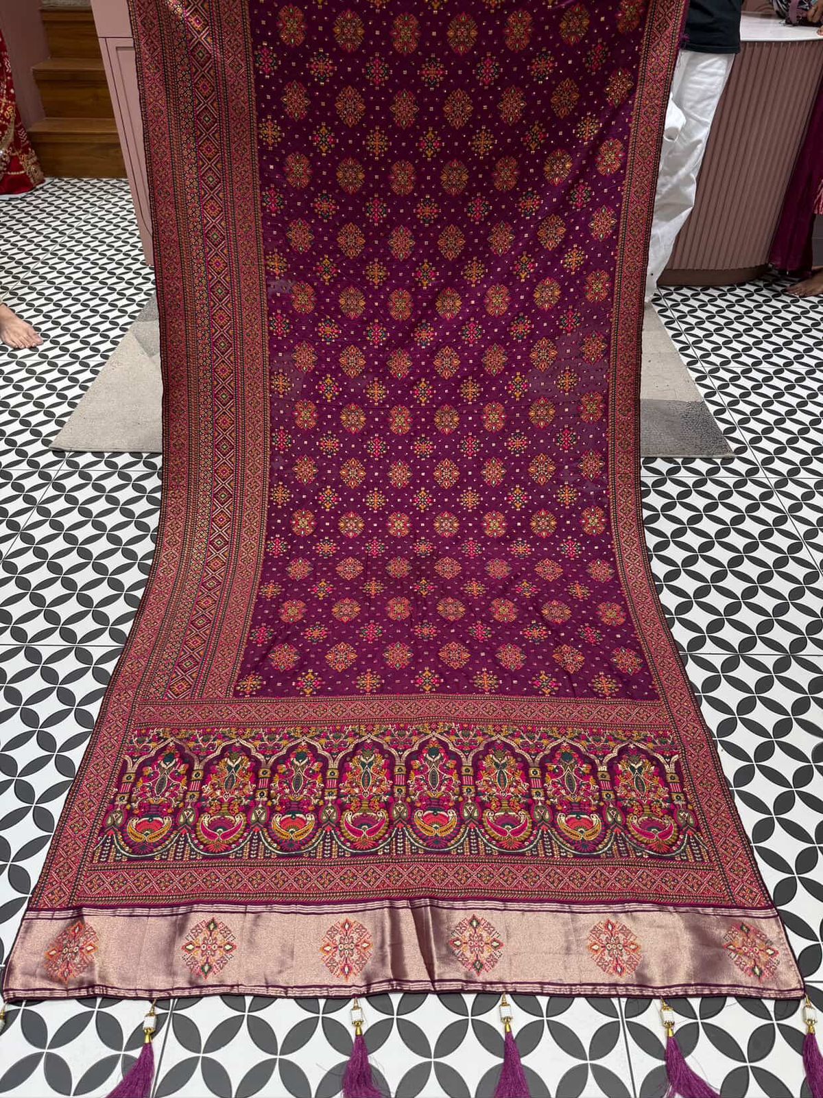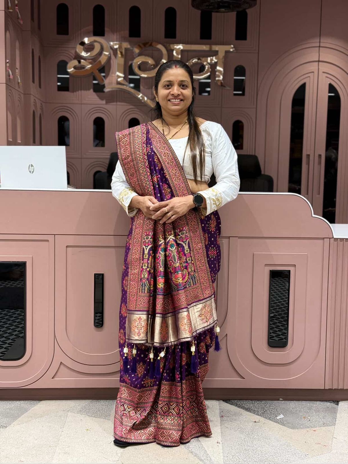 Elevate your festive and wedding look with this Pashmina saree featuring intricate embroidery, lagdi patta pallu, and stylish latkans. Exclusively from Shagun Sarees Surat.