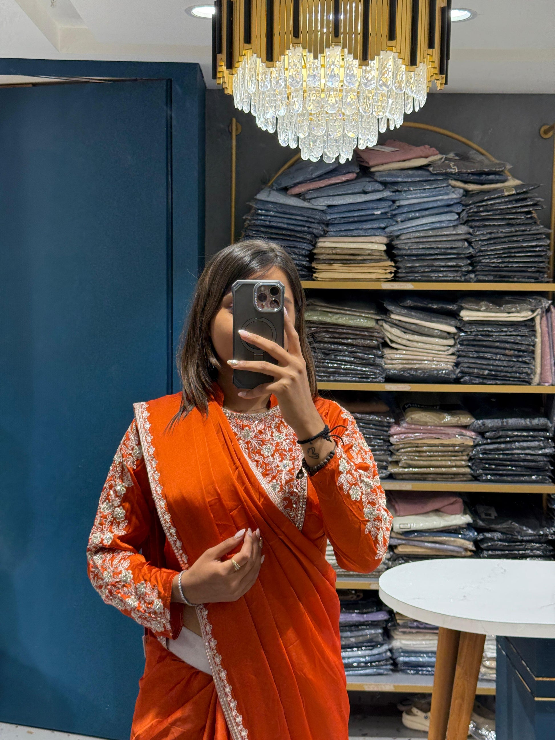 Step into elegance with this premium embroidered saree set from Shagun Fashion, curated by Zankhi Boutique. Made from rich, smooth-finish fabric, it features a heavily embroidered blouse with intricate floral zari work on the front and sleeves. The saree has a delicate lace border and tassel-detailed pallu for a festive touch. A matching embroidered belt adds a chic Indo-western flair. Perfect for weddings and parties, this set blends luxury and value effortlessly.