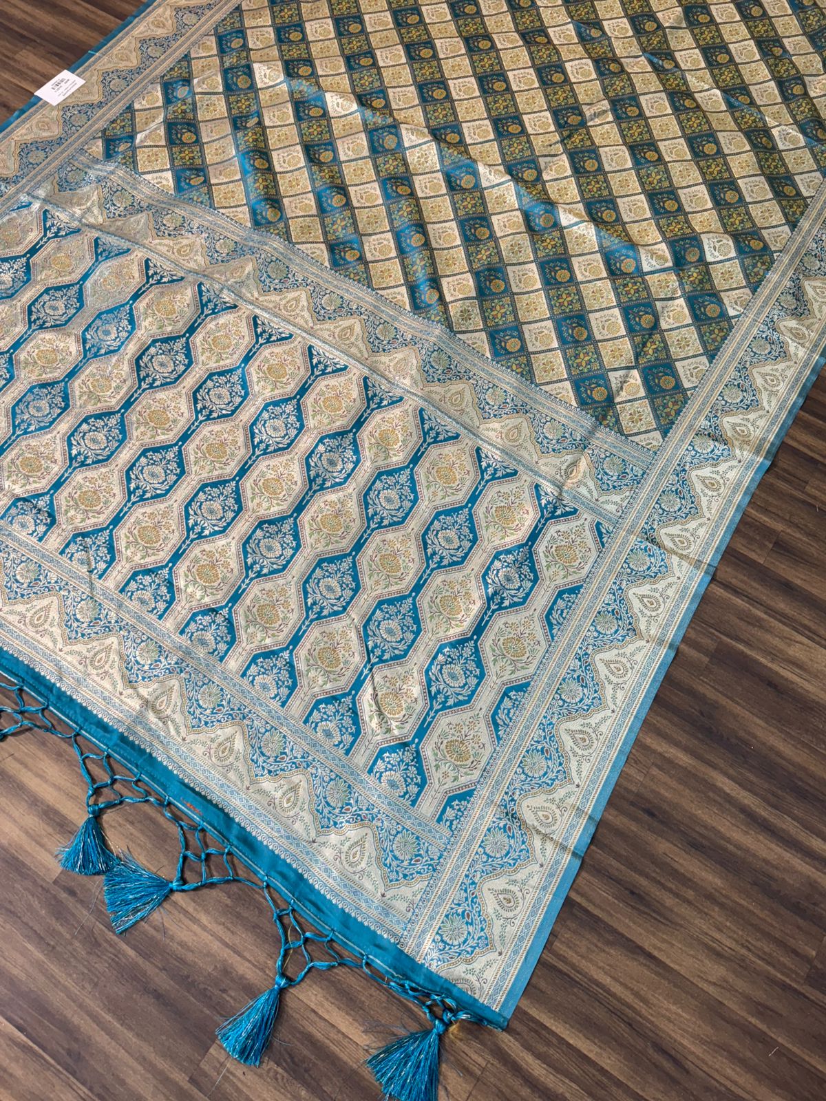 Discover elegance with this premium silk saree featuring intricate zari work, geometric floral motifs, and a richly designed paisley pallu. Perfect festive and wedding wear from Shagun Fashion and Zankhi Boutique, complete with decorative tassels for a royal look.