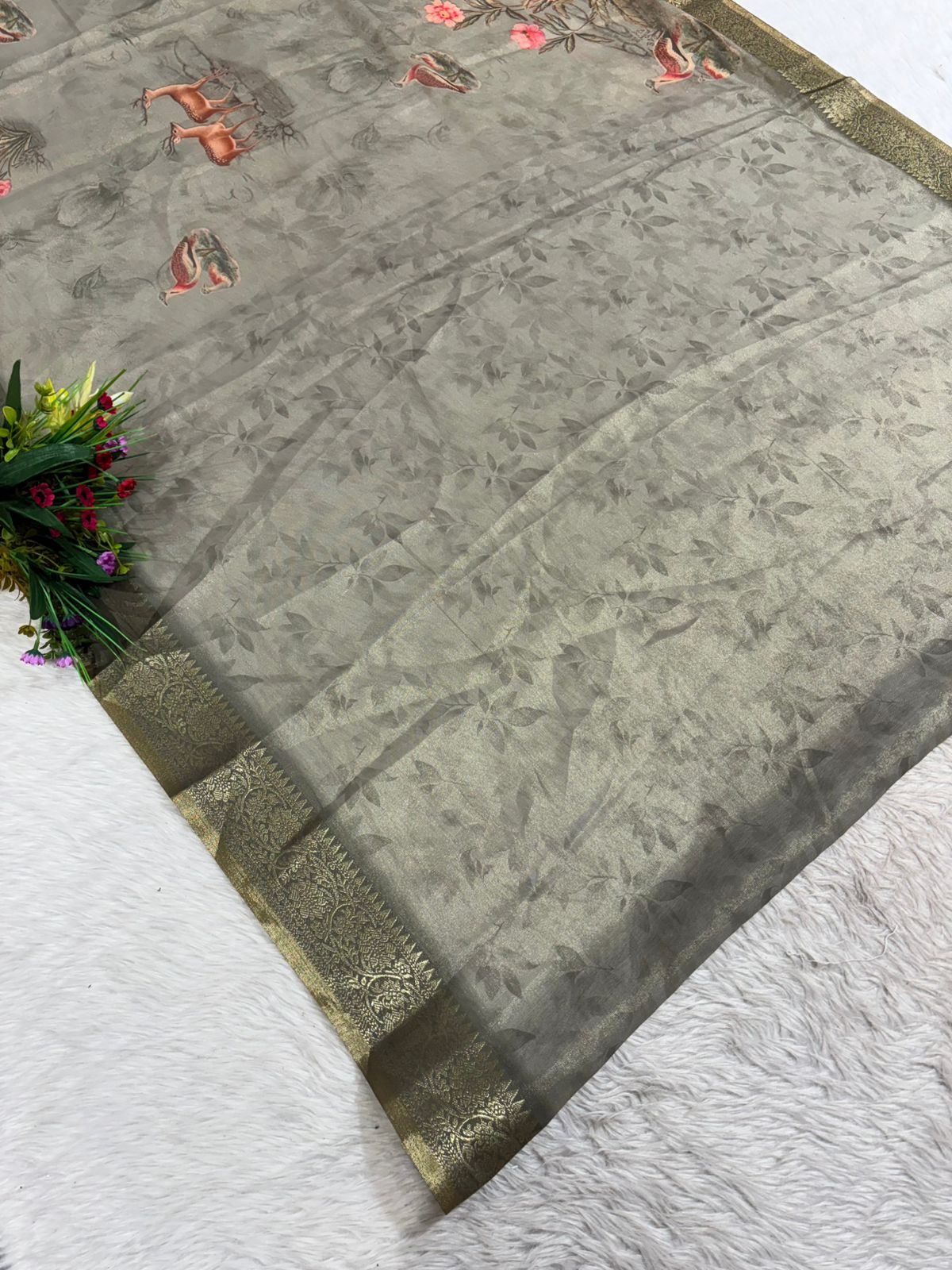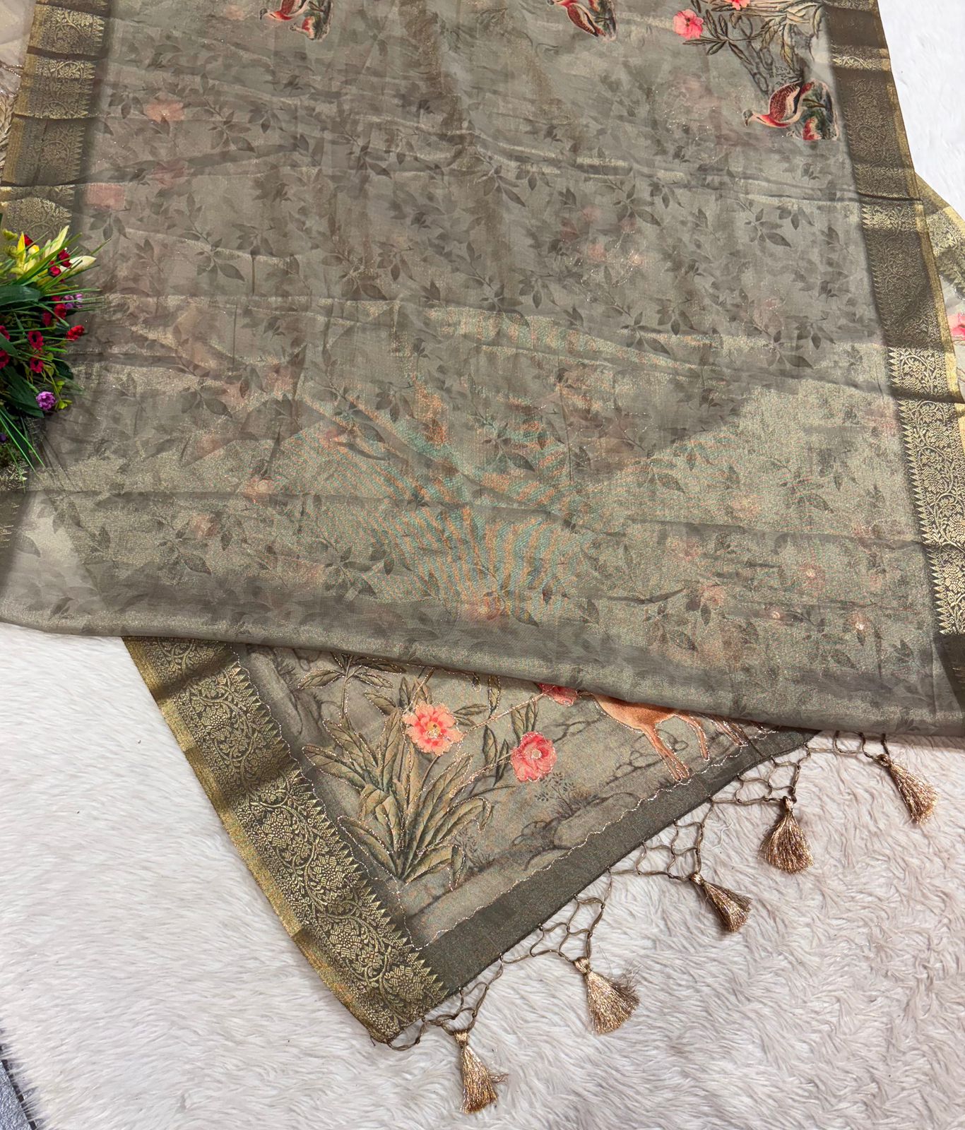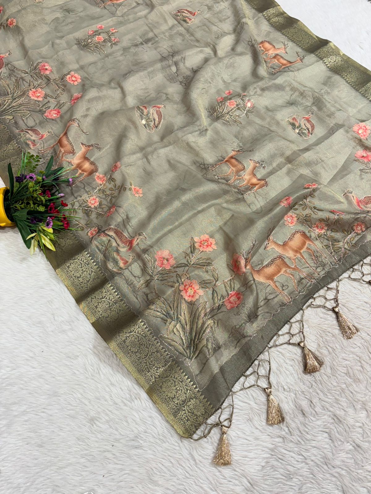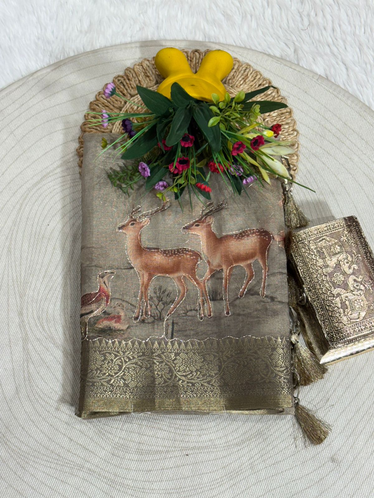 Discover elegance with this Banarasi silk saree from Shagun Fashion. Featuring intricate deer and bird motifs with floral embroidery, this saree beautifully blends tradition and artistry. The zari border with tassel pallu adds festive charm, making it perfect for weddings, parties, and cultural celebrations. Available exclusively at Zankhi Boutique and Shagun Sarees.