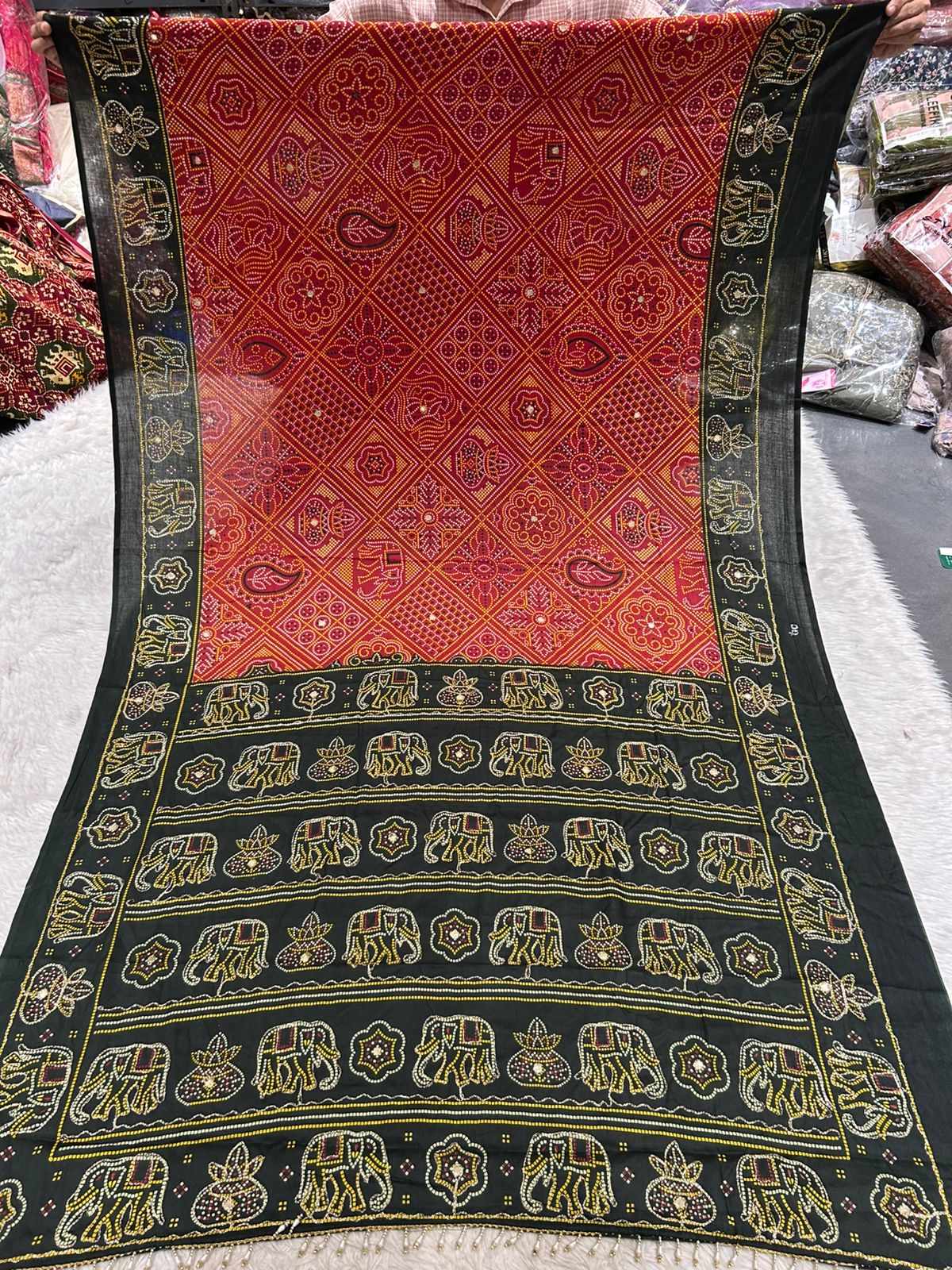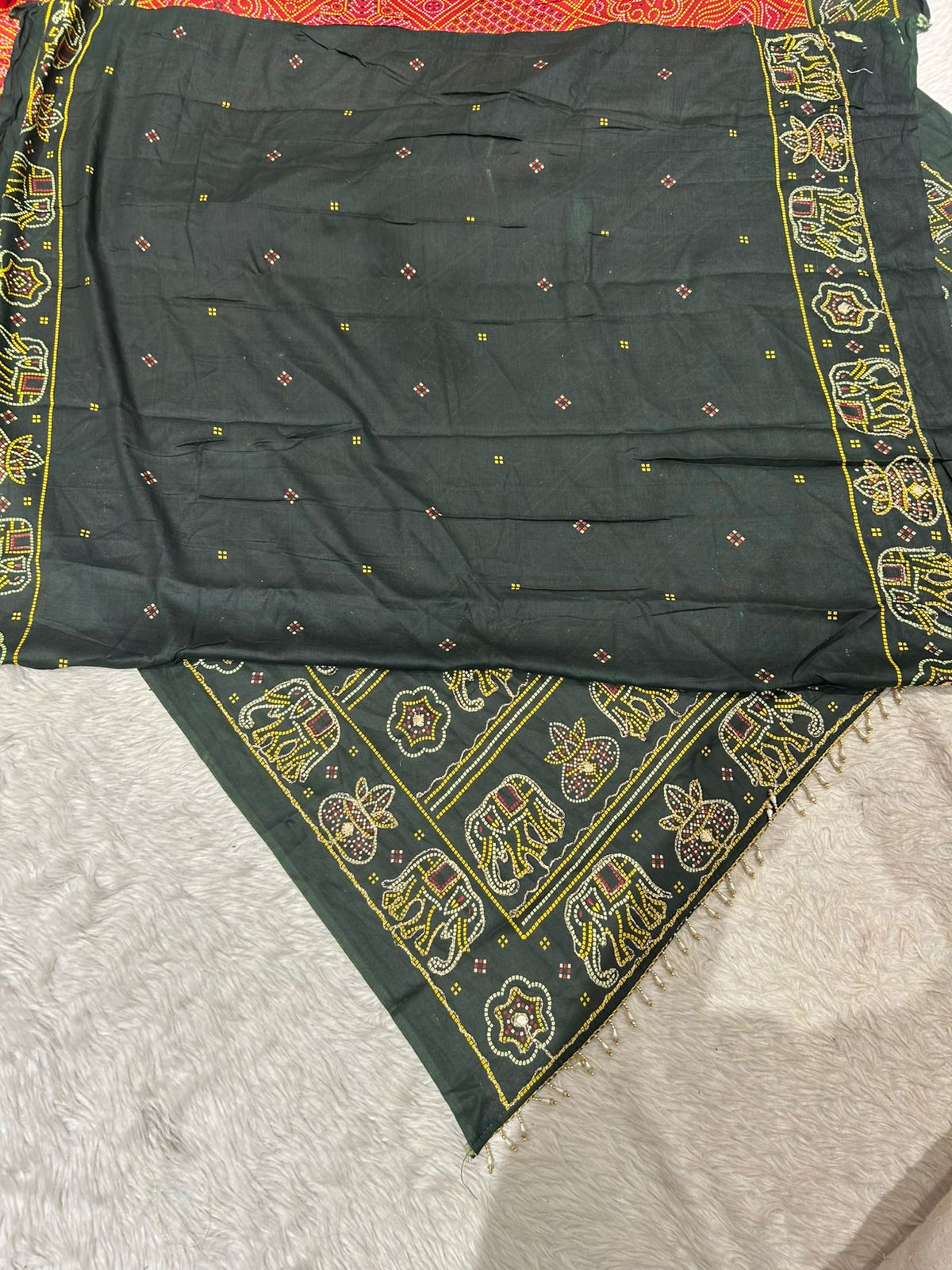 Celebrate timeless elegance with this Gharchola Bandhani saree from Shagun Fashion. Designed in rich red and black, it features auspicious Bandhani tie-dye patterns, elephant and kalash motifs, symbolizing prosperity, strength, and good fortune. Perfect for weddings, bridal trousseau, and festive occasions, this saree from Zankhi Boutique by Shagun Sarees adds a touch of heritage and tradition to your wardrobe.