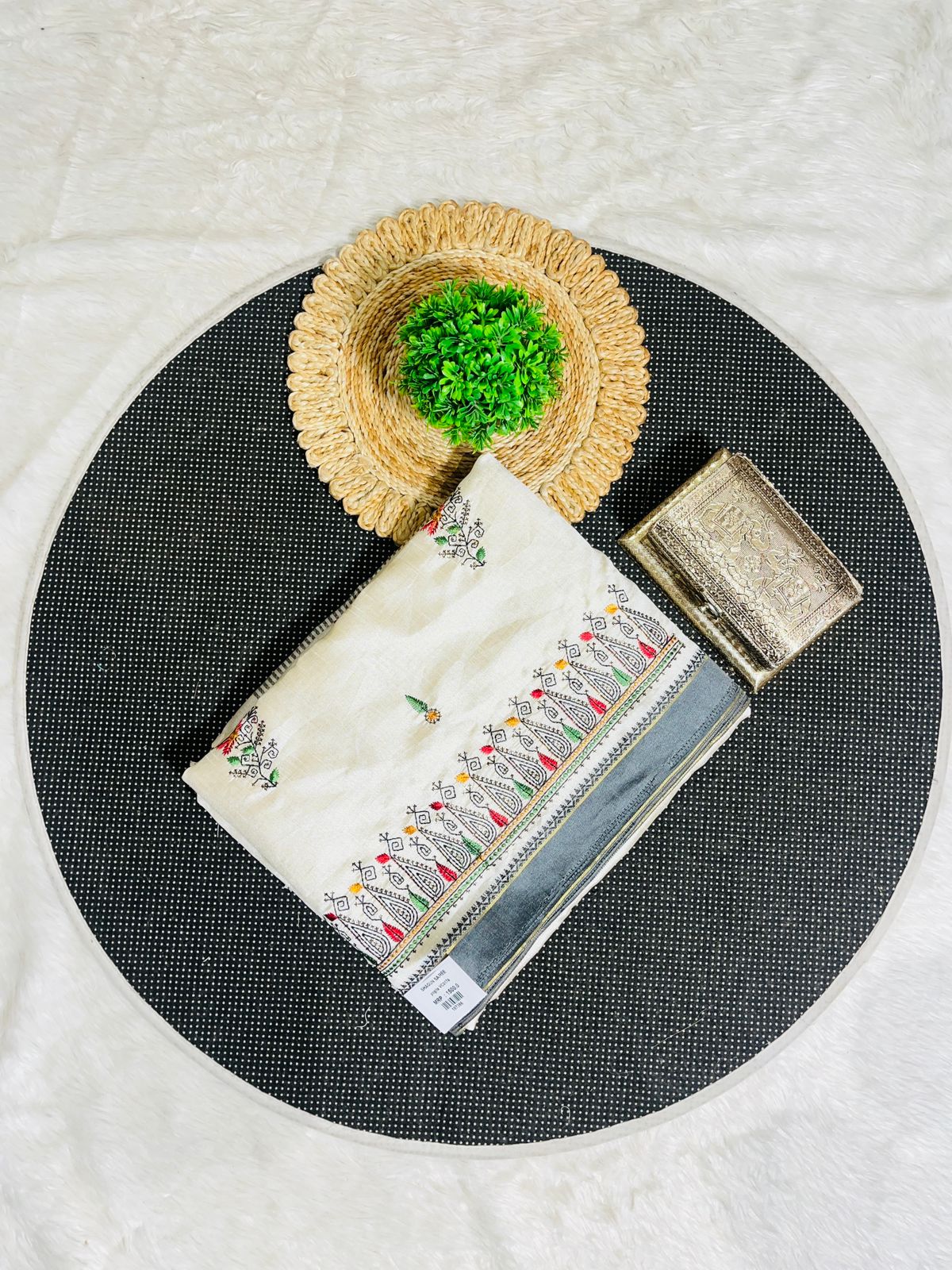 Elegant Beige Printed Saree with Colorful Pallu & Tassels